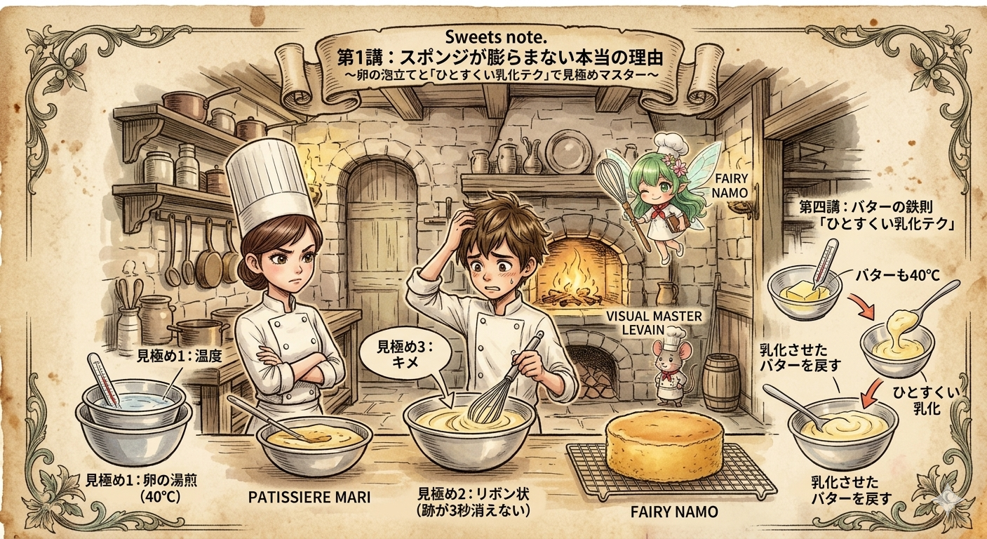 「うぅ、マリさん……。卵は白くなるまで立てたし、粉もさっくり混ぜたはずなんです。でも、最後に溶かしバターを入れた瞬間に、シュワシュワって泡が消えちゃって……」